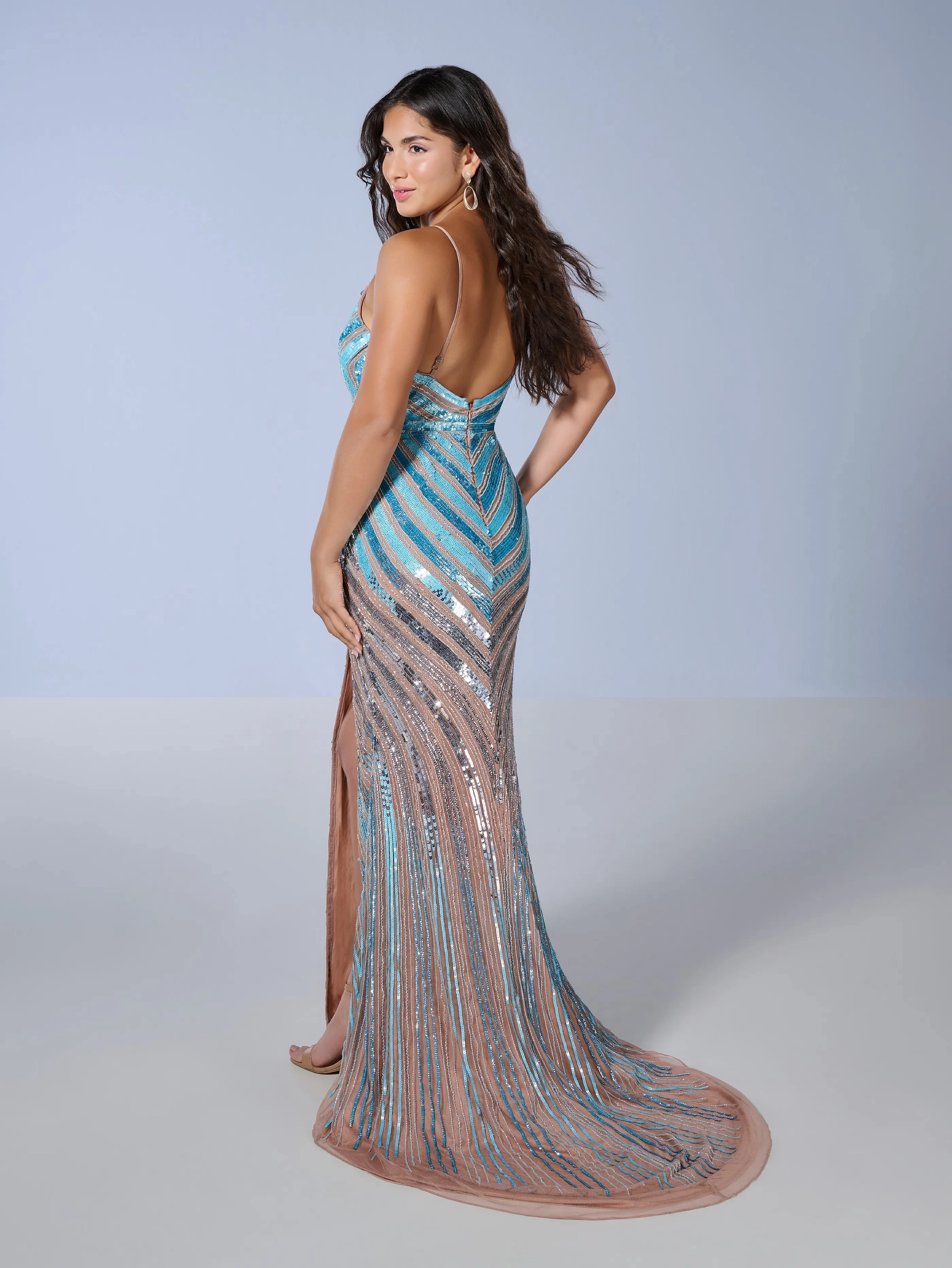 A slim fit gown made with high tide embellished mesh with a lovely V-neck top and slight train.
